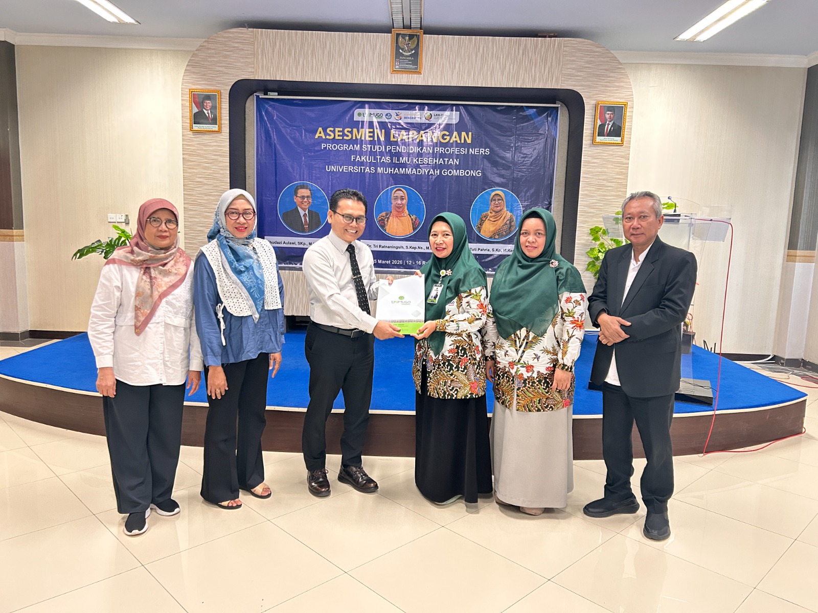 Hadir secara langsung Rektor Universitas Muhammadiyah Gombong (UNIMUGO) Prof. Dr. Sofyan Anif, M.Si, Dekan Fakultas Ilmu Kesehatan Eka Riyanti, M.Kep, Kaprodi Pendidikan Profesi Ners Wuri Utami, M.Kep, Kaprodi Keperawatan Program Sarjana, serta Tim Task Force Akreditasi Prodi Pendidikan Profesi Ners Program Profesi.